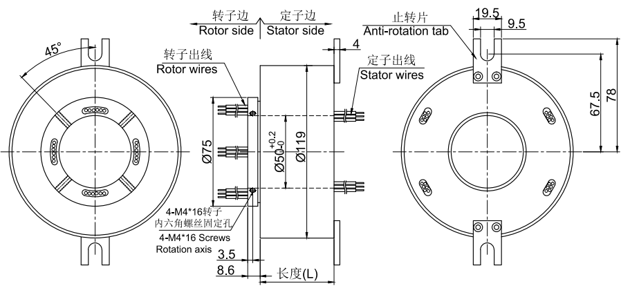 • · 外徑119mm, 通孔直徑為50mm(適用于<=50mm)的標準系列整體式精密導電滑環。*注意:如需<50mm的內孔,可通過加內襯軸套解決。