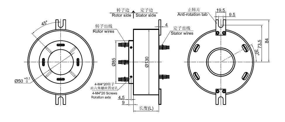 • · 外徑130mm, 通孔直徑為50mm(適用于<=50mm)的標準系列過孔多路數導電滑環。*注意:如需<50mm的內孔,可通過加內襯軸套解決。