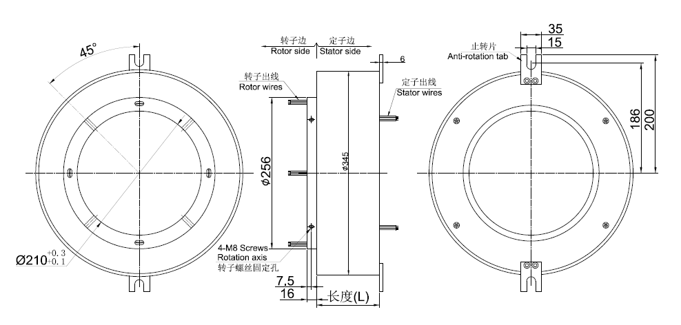 • · 通孔直徑為210mm(適用于<=210mm)的標準系列整體式精密導電滑環。*注意:如需<210mm的內孔,可通過加內襯軸套解決。