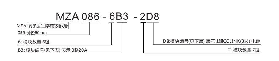 *比如MZA086-6B3-2D8, 其中6B3-2D8是指:6組3路20A(即18路20A)+2組1根CCLINK(3芯)電纜