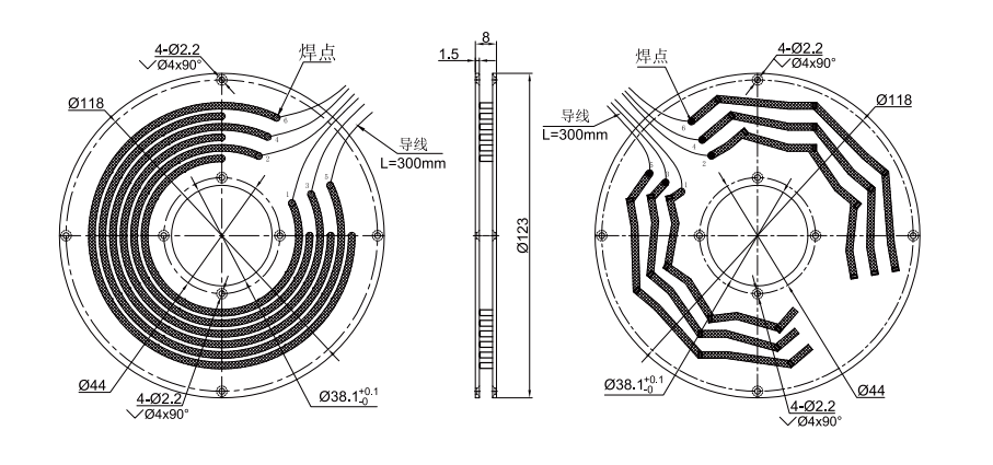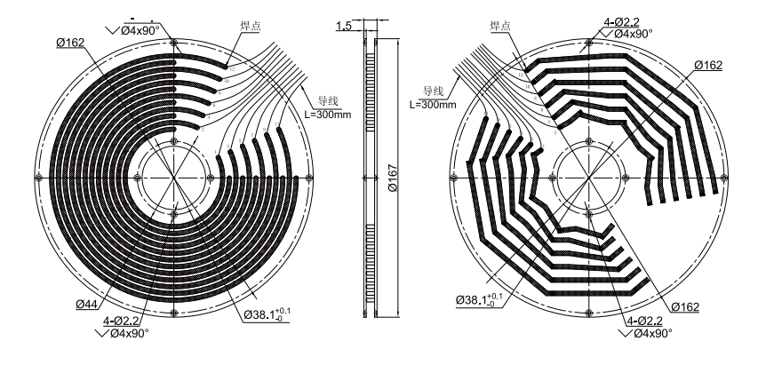 • · MPCB038C系列超薄盤式滑環,創新性使用PCB基材,最薄可達8mm,采用超硬鍍金處理,超厚銅箔工藝,最大電流可達10A, 定子線和轉子線對應使用彩色導線,簡化了安裝和連接。